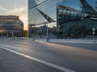 This image showcases the modern architecture and urban design of Berlin, Germany. The clear sky and sunshine illuminate the city, creating a vibrant and lively atmosphere. The empty city street is lined with glass and steel buildings, representing the bustling business and financial districts. Two bikes parked beside the road add a touch of city life to the scene. This photo captures the break of day in Berlin, where the sun is visible and signals the start of a new day in this bustling European city.