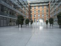 the lobby area of an office building has potted trees inside of it and a walkway leading to it
