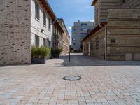 This stock photo captures the lively city life in Berlin, Germany. The clear blue sky provides a perfect backdrop for the classic architectural features of the brick buildings. The image showcases a charming courtyard in a Hinterhof, with a hotel and museum in the background. The urban design of the alley-way and the open space creates a unique atmosphere in this European city. The surface of the brick wall and the warehouse of a factory are visible, adding an industrial touch to the scene. This photo is perfect for projects related to architecture, urban life, and city exploration.