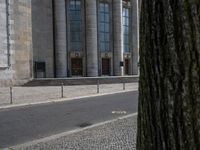 Classic architecture in Berlin, Germany, with the iconic Volksbühne theater. Urban design features include asphalt roads and curbs in the foreground. Clear European sky sets the backdrop for a bustling city scene.