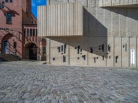 A modern architecture warehouse in Berlin, Germany's city life. Clear skies cast hard shadows on cobblestone surfaces. Urban design with open spaces and courtyards. A glimpse of Europe's urban architecture.