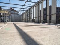 inside of an industrial building that has white paint on the floor and white wall with green lines