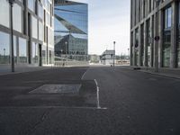 an empty city street with some buildings and clouds in the background in this image, a blue building is reflected in the glass