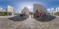 A vibrant street scene in Berlin, Germany. Cobblestone road lined with urban graffiti walls and bustling restaurants. Clear sky casts hard shadows on the straight road. Capturing the essence of urban design in Europe.