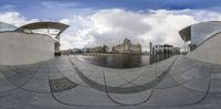 Aerial view of Berlin's city life with modern architecture. Grey sky adds to the gloomy atmosphere. Glass walls and surfaces reflect the wet roads and open spaces. Classic architecture stands in foreground, while the River Canal flows under bridges and through underpasses.