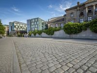 A modern architecture office building in Berlin, Germany. The clear sky above reflects on the glass surface, highlighting the city's thriving business district. Cobblestone road surface adds to the charm of this European city.