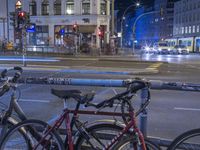 bicycles parked at a rail on a city street at night near buildings and cars parked along a roadway