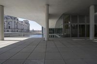 This is an image of a modern office building in Berlin, Germany. The architecture is characterized by its clean lines, concrete flooring, and glass walls. The building is located in the heart of the city, within the bustling business district. The surrounding open spaces and cityscape provide a vibrant urban environment. This photo captures the essence of urban design and city life in Berlin, a major tourist attraction in Europe.
