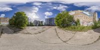 A 360-degree view of Berlin's city park, showcasing its urban design and art district. Trees and buildings create a rugged yet vibrant atmosphere. The clear sky enhances the graffiti walls and basketball court in the courtyard.