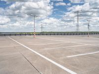 A modern architecture cityscape in Berlin, Germany. The city features wide open spaces, with roads and parking decks made of composite materials. Tall trees and green grass add to the landscape, while clear skies and cumulus clouds create a serene horizon. Electricity powers the street lights on the concrete roads, making for a vibrant and lively atmosphere.