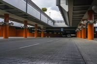 an empty sidewalk and two parked cars under a concrete walkway area, beneath a parking garage