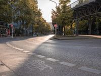 A scenic view of a crosswalk in Berlin city, Germany, with cars parked on the road below. The road surface is made of asphalt, and it is a sunny day with clear skies, making the sun visible. Trees along the road are filled with yellow leaves, indicating the arrival of autumn. The bridge overhead adds to the urban infrastructure of the town. This public space is a busy thoroughfare, as indicated by the lane markings on the road. The image captures the morning dawn, with the shadow of the trees and cars visible. The subway station in Kreuzberg can also be seen in the background. The image portrays the bustling urban transport system in Europe.