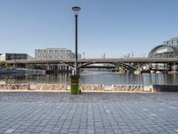 This is an image of the city of Berlin, Germany, showcasing its modern architecture and urban design. The photo captures a clear sky above the city, with the horizon stretching out towards a lake and a pier. The road surface is made of asphalt and cobblestone, lined with street lights. Buildings and museums can be seen along the bank of the lake, adding to the cityscape. The image represents the vibrant city life and the combination of historical architecture with contemporary infrastructure. It reflects the unique blend of old and new in Berlin.