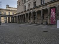 A stone path leads through the courtyard of a classic building in Berlin, Germany. The building features pillars and a sign reading 'Musees du Crec' between the columns. This urban oasis is a perfect escape from the hustle and bustle of city life.