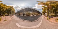 fish - eye view of a city street with trees and a bridge, and in the middle there is a street