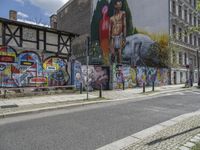 an empty city street has a wall with a mural on it next to a street