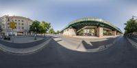Panoramic view of a city street in Berlin, Germany. The fish eye lens captures the curved road, pedestrian bridge, and diverse architecture. The clear sky and vibrant graffiti add to the urban design.