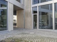 A modern architecture building in Berlin's business district. The concrete facade with composite material fixtures creates a sleek urban design. The building stands tall against a backdrop of cobblestone roads and lush vegetation.
