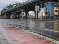 A view of Berlin, Germany, with a bridge over water in the foreground. The cityscape features buildings, roads, and a railway track. The image captures a sunny day with clear blue skies and scattered clouds. The urban design and infrastructure can be seen throughout the metropolitan area. The road surface appears wet, and there is shade from trees along the thoroughfare. This stock photo represents the bustling and vibrant urban life of the capital city of Germany and the charm of European architecture.