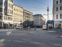 A bright day in Berlin, Germany, with clear skies and bustling urban streets. Residential buildings line the asphalt roads, while trams and automobiles navigate the urban infrastructure. Open spaces and street lights add to the city's urban design.