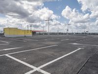 empty parking lot in a car park under a cloudy sky with white clouds above it