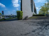 A modern, urban cityscape in Berlin, Germany. Cobblestone streets wind along the river, casting hard shadows on the modern architecture. Open spaces invite residents to enjoy the urban design and take in the views of the city and water.