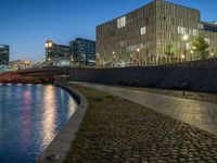 Experience Berlin's business district at dawn. The clear sky reveals modern architecture along the canal, enhanced by artificial light. Urban design combines city life and river views in this vibrant European cityscape.