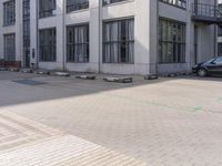 This image captures the vibrant cityscape of Berlin, Germany. The photograph showcases a residential area with buildings and courtyards surrounded by open spaces. The wide asphalt roads and lined composite materials create a modern and urban design. The scene includes parked vehicles with their tires and wheels visible. In the foreground, a sidewalk with curbs leads to a property with windows and an entrance. The photo represents a typical day in Berlin, highlighting the combination of residential and commercial spaces that make the city unique. An authentic representation of urban life in Europe.