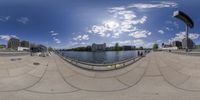 an artistic photo of the lake and sidewalk from a fish - eye lenser's perspective
