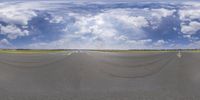 a mirror image shows a wide angle shot of a runway surrounded by cloud filled sky