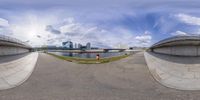 A modern cityscape in Berlin, Germany. The fish-eye lens captures the symmetrical architecture and straight roads. The park near the river bank provides a peaceful urban oasis. Buildings tower against the clear sky, reflecting the city's urban design.