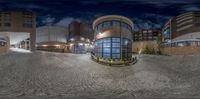 Berlin cityscape at night, featuring classic European architecture and cobblestone alleyways. Aerial view showcases urban design with warehouse storage and storehouses. Artificial light illuminates the brick walls of Hinterhof courtyards.