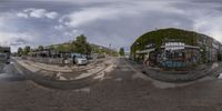 A fish-eye lens captures the beauty of Berlin's cityscape. Parked cars line the road, while classic architecture and graffiti walls create an artistic atmosphere. The grey sky adds a gloomy touch to this urban scene.