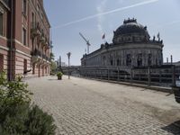 A view of Berlin's cityscape on a clear day, showcasing its classic architecture and urban design. Cobblestone roads lead to the Bode Museum, a popular tourist attraction. The residential area is surrounded by trees, adding to the charm of this European city.