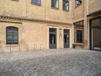 This stock photo shows the entrance of a building in Berlin, Europe. The classic architecture features a wooden door and a brick facade. The cobblestone street and brick walls create a charming and historic atmosphere. The open courtyard provides an inviting and spacious area. This image captures the beauty and character of Berlin's architecture and showcases the old-world charm of Europe. The photo was taken during the day, allowing for natural light to enhance the details of the brickwork and wooden fixtures. It is a perfect representation of classic European architecture.