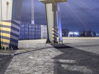 A red fire hydrant stands outside a container port in Berlin, Germany. It is raining at night, with a stop sign next to the hydrant. The image captures the city's urban landscape, with water on the asphalt and buildings in the background. The open space offers a view of various facades, including a factory. Clouds fill the dark sky, creating tints and shades. The road surface, made of cobble stones and tar, leads to a pier and warehouse in the harbor, where cranes can be seen. The blue jetty adds to the industrial atmosphere, with container landing and gas operations visible. This image reflects a glimpse of Europe's urban and industrial scenery.