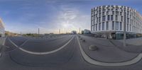Early morning in Berlin's financial district. Modern architecture and office buildings dominate the urban landscape. Clear sky and a traffic light add to the urban design. A bustling business district in Europe.