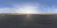 an empty runway with some clouds and sun setting behind it is an image of a beautiful sky