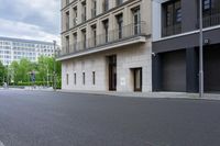 An empty street in Berlin lined with modern architecture. A skateboarder glides past the residential area, capturing the essence of urban Europe. Clouds fill the sky on a typical day in Germany's vibrant capital city.