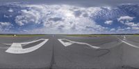 A large empty tarmac in Berlin, Germany. Arrows and white writing on the road surface indicate different directions. Clear skies and a straight road create a sense of urban design. The asphalt reflects the sunlight, adding a touch of brightness to the landscape.