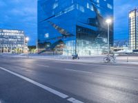 A bustling city street in Berlin's financial district during twilight. Modern architecture and artificial lighting create a vibrant urban atmosphere. People can be seen walking on the road in front of office buildings.