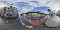 Aerial view of Berlin, Germany, showcasing the city's stunning architecture. Rainy street creates a reflective pattern on the asphalt road. Urban landscape features residential areas, bridges, and underpasses. Grey sky adds to the urban atmosphere.