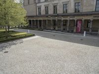 Aerial view of Berlin, Germany showcasing classic architecture and elevated open spaces. Cobblestone roads and asphalt driveways line the city, surrounded by lush green grass and trees. The Alte Nationalgalerie museum stands tall in the European cityscape.