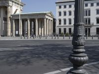 This is an image of the iconic Brandenburg Gate in Berlin, Germany. The gate is an architectural masterpiece and a popular tourist attraction in the city. The classic architecture of the gate is highlighted by the clear sky in the background. The road leading up to the gate is made of asphalt, emphasizing the urban design of the city. The facade of the gate features columns and arches, reminiscent of ancient Roman temples. This photo captures the essence of city life in Europe and showcases the timeless beauty of Berlin's architectural heritage.