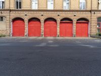 red firehouse doors line an empty road near an apartment building with arched arch windows