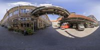Panoramic view of a bustling street in Berlin, Germany. Architectural diversity with mixed-use buildings and cobblestone roads. The passing bus adds movement to the scene. European city life captured in a snapshot.