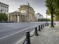 This image captures the iconic Brandenburg Gate in Berlin, Germany. The classic architecture of the gate contrasts with the modern urban design of the surrounding buildings. The clear sky above adds to the vibrant city life. The tree-lined road and the public space in front of the gate create a welcoming atmosphere for tourists. This photo represents the beauty of Berlin's architecture and its status as a popular tourist attraction. Explore the charming streets of this historic city in Europe.