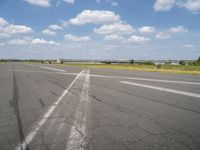 An open space in Berlin, Germany, with asphalt roads and tree-lined fields. The clear sky and cumulus clouds create a picturesque landscape. The Tempelhof airport runway adds a touch of history and recreation to the scene.