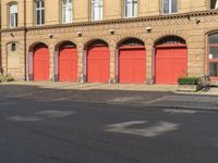 a person on a bicycle is walking down a street past an older brick building that has five red doors