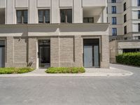 a building has plants in the front of it and bushes on the sidewalk with doors
